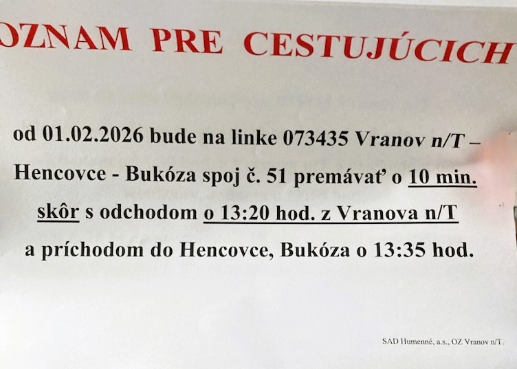 SAD Humenné, OZ Vranov n. T., oznamuje cestujúcim na linke 073435 Vranov n. T. - Hencovce - Bukóza, že od 01.02.2026 bude spoj č. 51 premávať o 10 minút skôr, s odchodom o 13.20 hod. z Vranova nad Topľou, s príchodom do Hencoviec - Bukóza o 13.35 hodine.